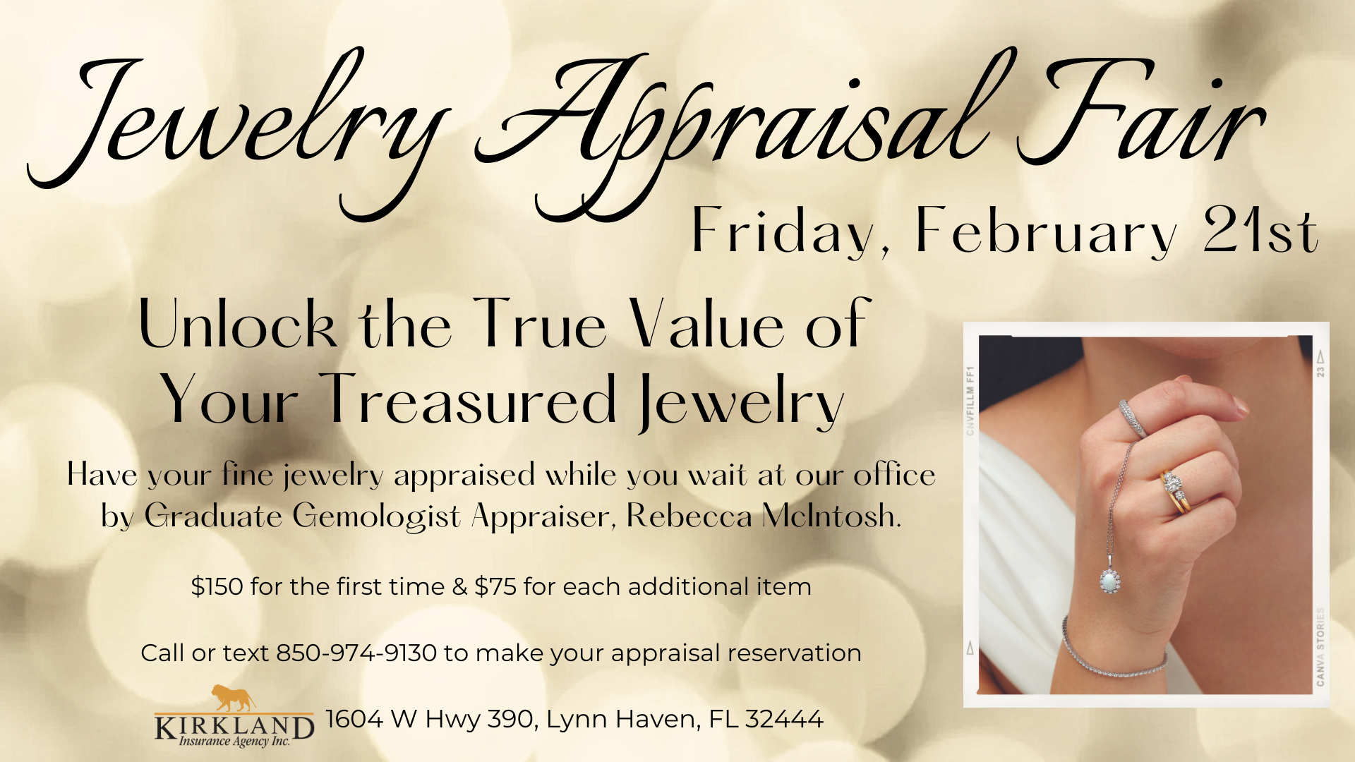 When was the last time you updated your jewelry appraisals? If it has been more than 2-5 years, you might be at risk of underinsurance. Join Rebecca McIntosh, a Graduate Gemologist and experienced Jewelry Appraiser, at a Jewelry Appraisal Fair at Kirkland Insurance on Friday, January 24th to ensure your cherished pieces receive the insurance coverage they deserve.