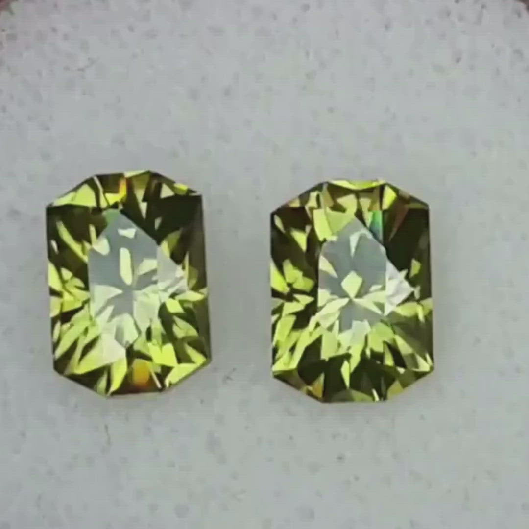 The color of these stones is so rare and exquisite for zircon, pair that with this master cut design, the light display from being double refractive with the pleochroism of greens and yellow, you've got to take a moment to breathe. These beautiful zircons are set in platinum stud mountings with a Fleur de Lis accent on each side. These will be a gem collector's prized pair of earrings!