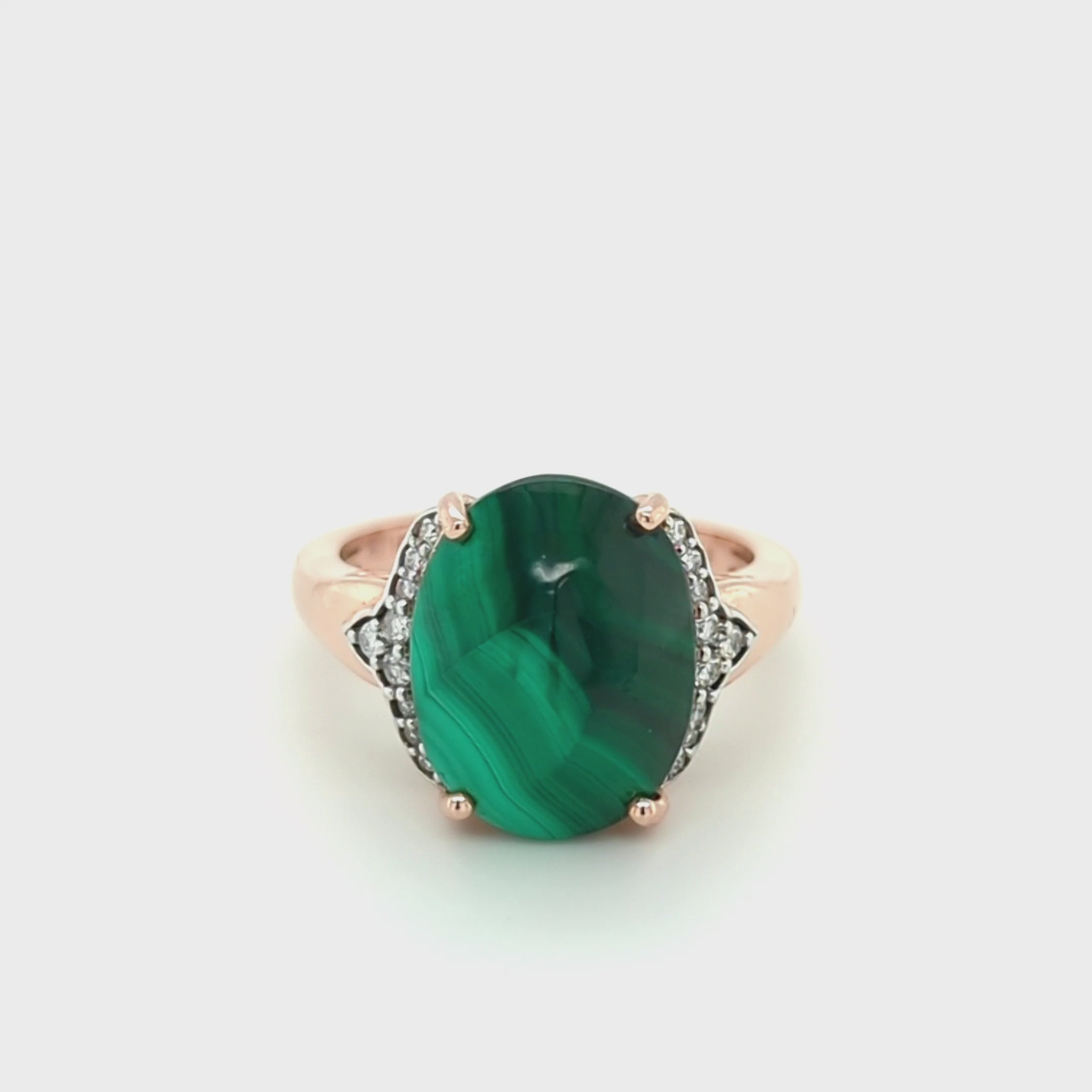 There are few things as lovely as the bands of malachite, and this malachite ring takes that beauty above and beyond! A 7.85ct sugarloaf malachite is set in a 14k rose gold ring and accented with 0.14ct of diamonds. Malachite has been known and used in Egypt for over 3,000 years and used by the Greeks and Romans as a pigment, jewelry, ornaments, and as eyeshadow. This beautiful stone brings enlightened leadership, creativity, confidence, protection, and healing of the heart.