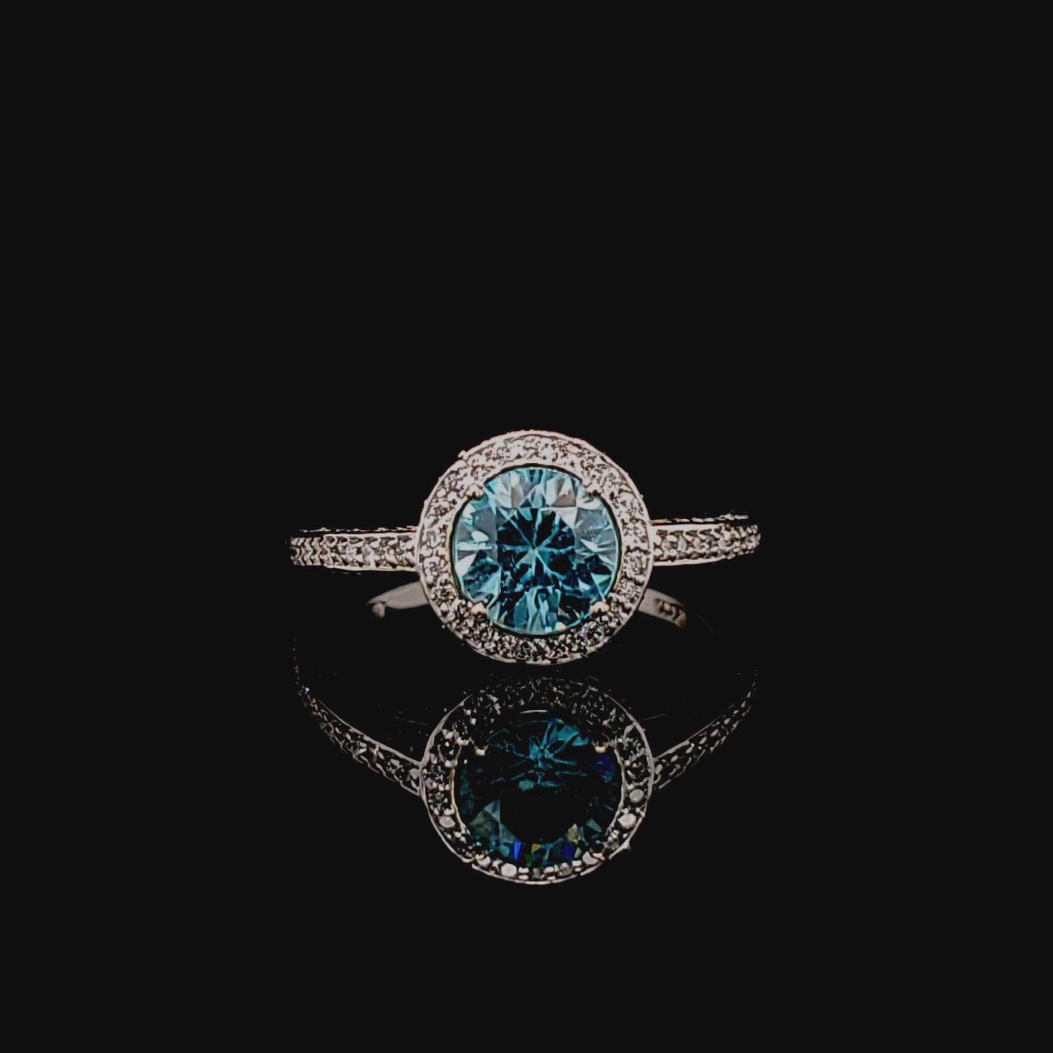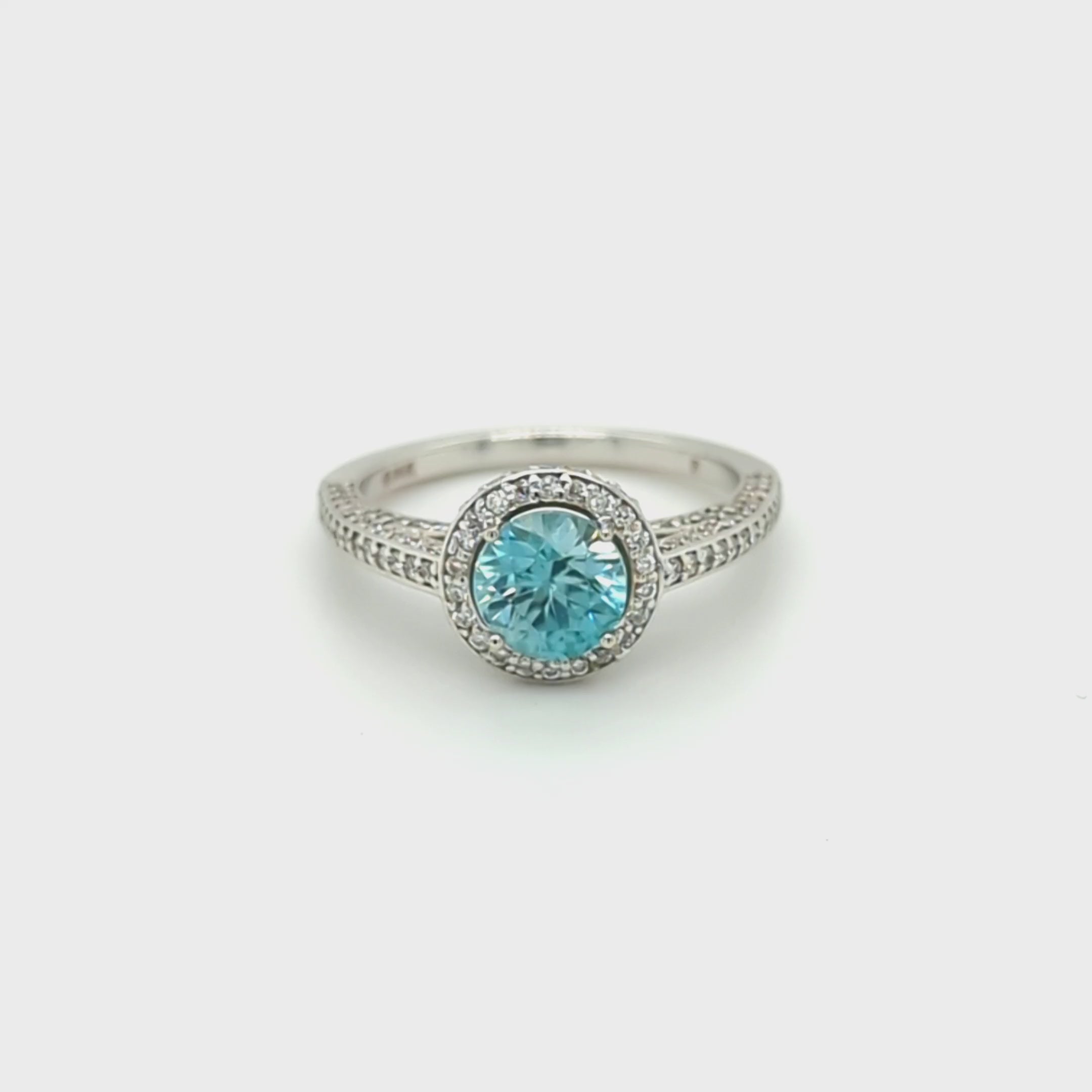Blue Zircon and Diamond Halo Ring in 14kt White Gold