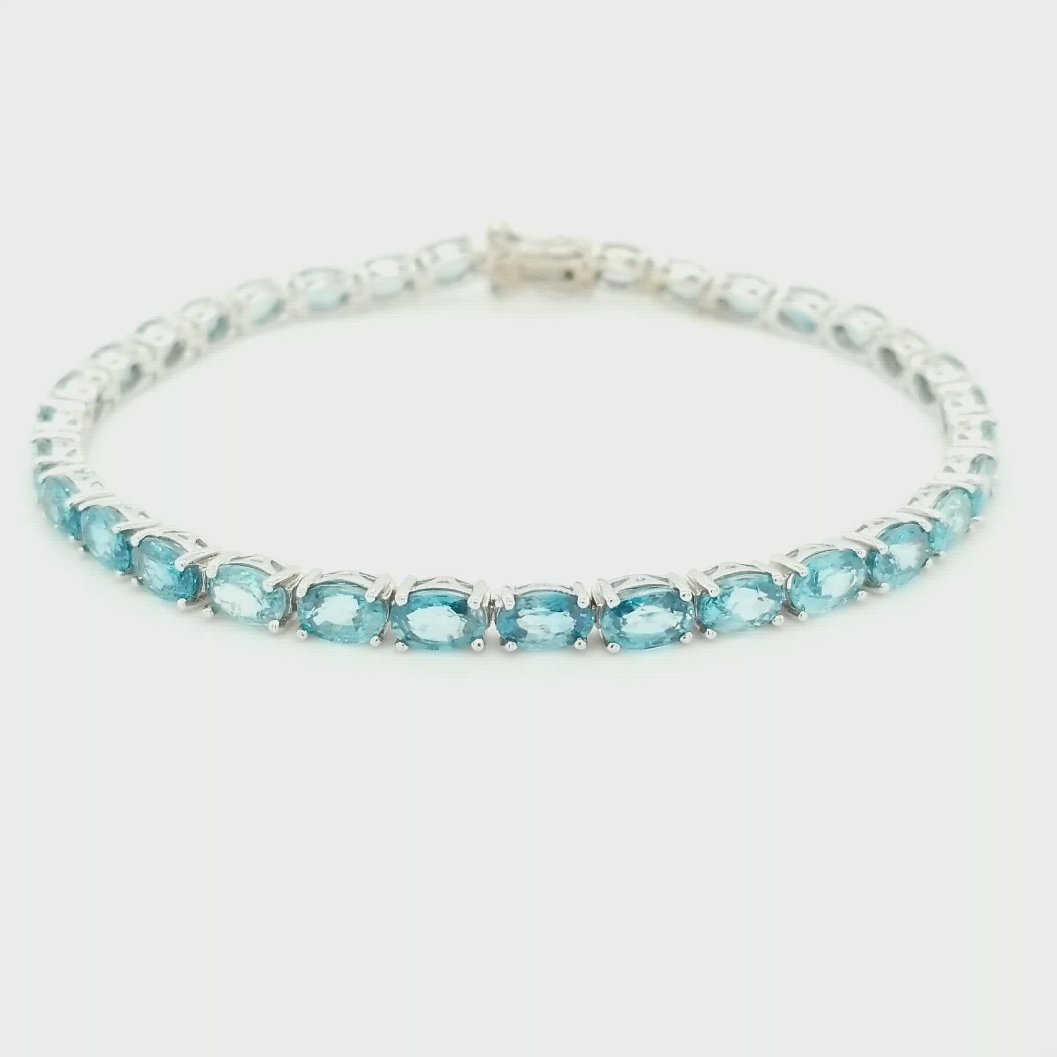 This bracelet is 8.25" long with 6x4mm blue zircons set in a rhodium-plated sterling silver bracelet. The button clasp is very easy to use and there is a security latch on the side to keep everything secure.