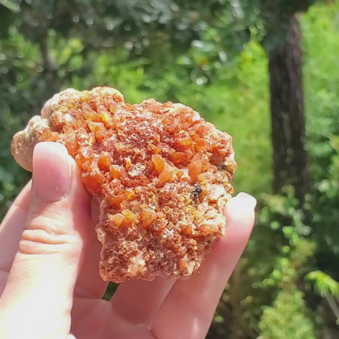Creedite is a favorite because it was one of the first crystals that the founder Rebecca ever collected! Creedite is named after its original discovery locale in Creede, Colorado. Creedite is usually found near fluorite as it is formed from the oxidation of fluorite ore. Creedite can be found in white, violet, purple, colourless, and orange; but can look colourless in transmitted light! Most specimens are going to be this cinnamon reddish orange color. Creedite helps us expand our awareness and activate our upper chakras while still being connected to our heart. It’s a spiritual realm stone so it’s helpful for doing soul searching, channeling spirit guides, and reading our own akashic records.