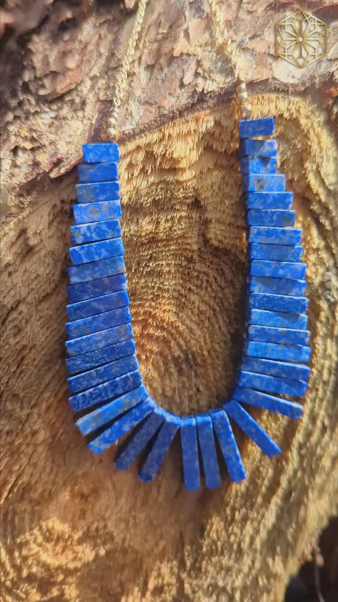 This Lapis Lazuli and yellow gold collar is made for royalty! Lapis lazuli has been loved by humans for over 6,500 years in Mesopotamia, Egypt, Greece, China, and Rome. When you see this beautiful color and pyrite marbling, it makes sense why! This necklace is definitely a collar at 16 inches long and rests right along the collarbone. This stunning Lapis Lazuli necklace features 39 tablets of natural lapis lazuli strung on a blue silk cord, with 14kt yellow gold beads and Italian made chain with a spring ring clasp. This is a necklace from the 1940s so this is considered "Old Material" from Afghanistan. Please note that this estate piece of jewelry was restrung with gold-colored end-caps and the 14kt yellow gold beads do have a few small dents from being loved. You will find photos of the dents in the photos and will find that it does not detract from the beauty of the piece.