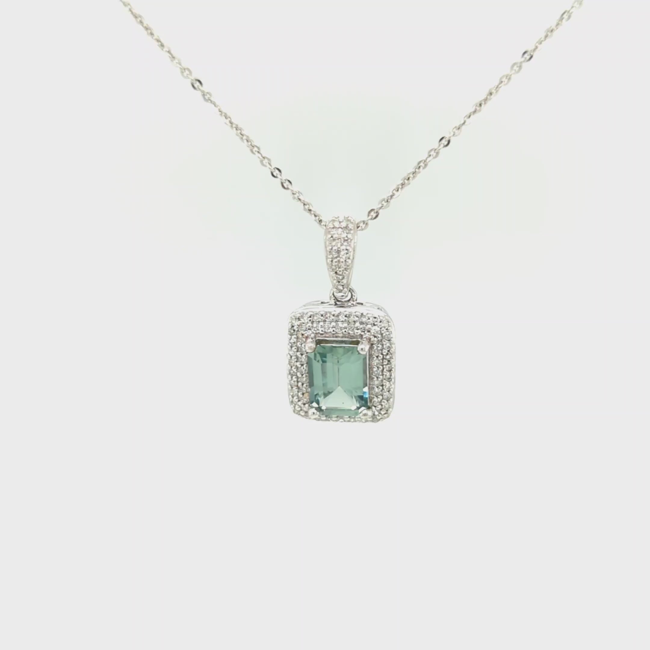 Light Blue-Green Montana Sapphire and Diamond 14kt White Gold Halo Pendant with Adjustable Chain