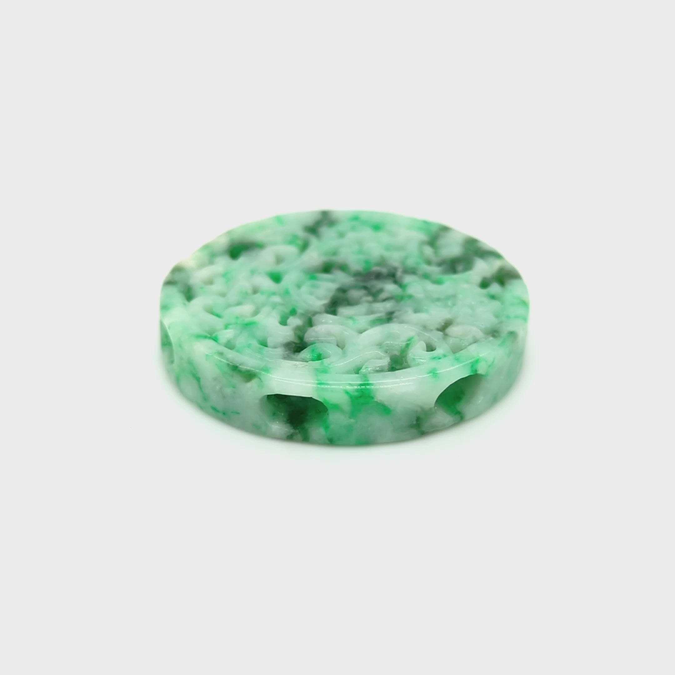 This jade coin medallion has not been treated in any way, this amazing mottled green and white coin is totally natural! There are multiple drill holes that you can see in the video to make this piece your own through beading or simply sliding onto a very sturdy chain. If you would like us to help with a chain selection, just let us know. We're always happy to help.