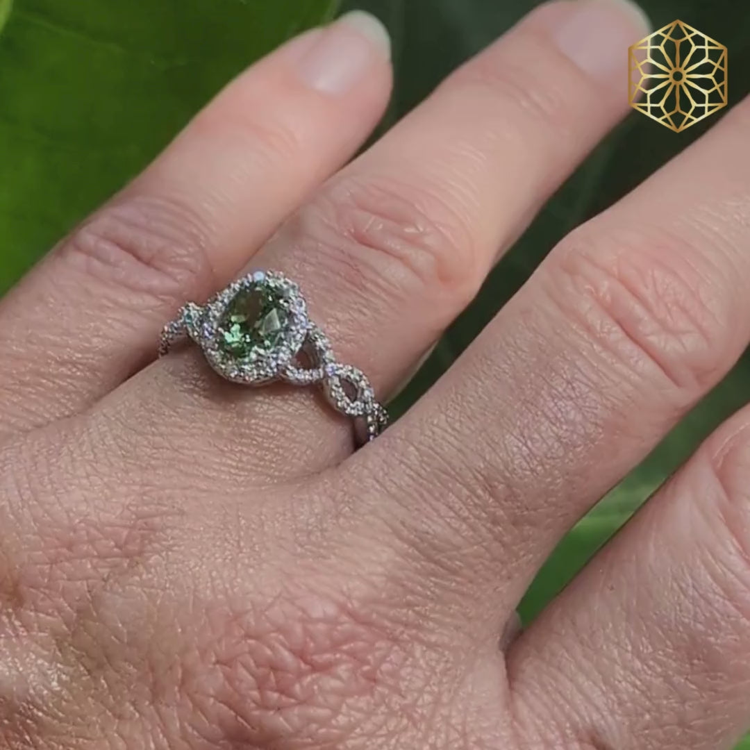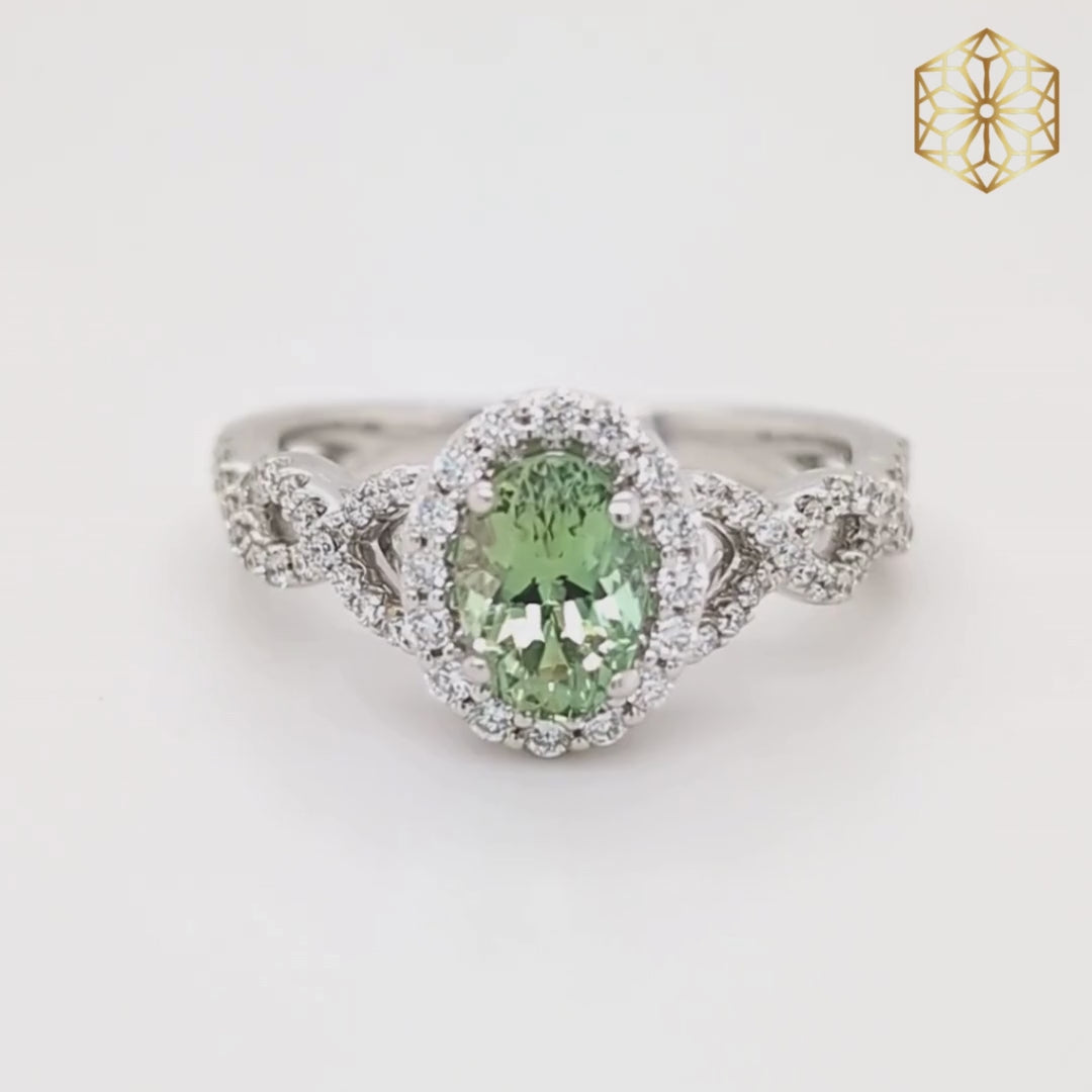 "Paramour" Mint Green Kornerupine set in 14kt White Gold Diamond Halo Ring