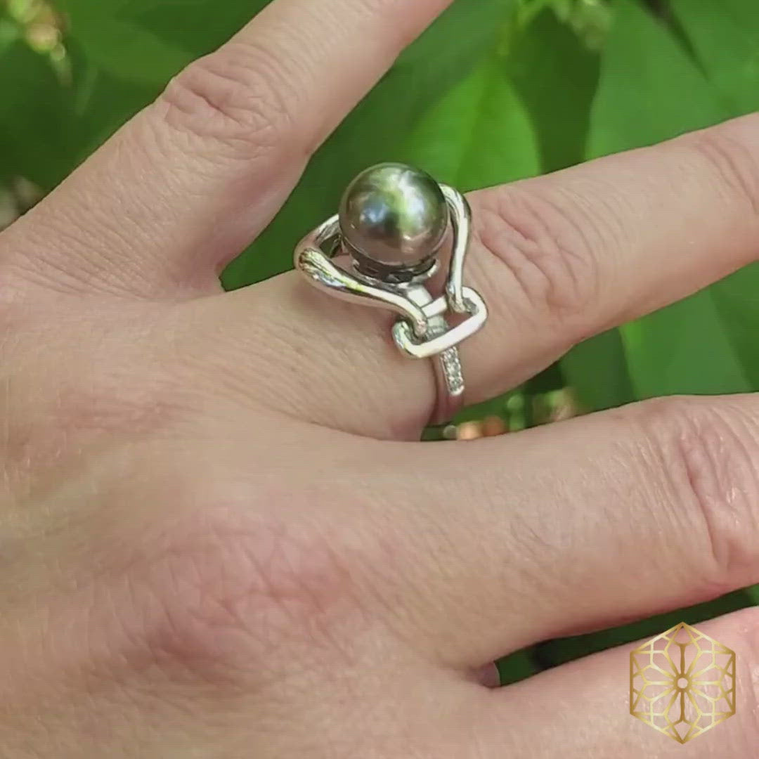 Pearl rings aren’t very common because it is hard to have a large sphere balance on your finger without looking a little weird… but this ring does it! The Tahitian is the perfect size at 9mm and is graced with a Caribbean Hook design and small White Topaz accents down the side. This is a great ring to accent and support your Tahitian pearl addiction.
