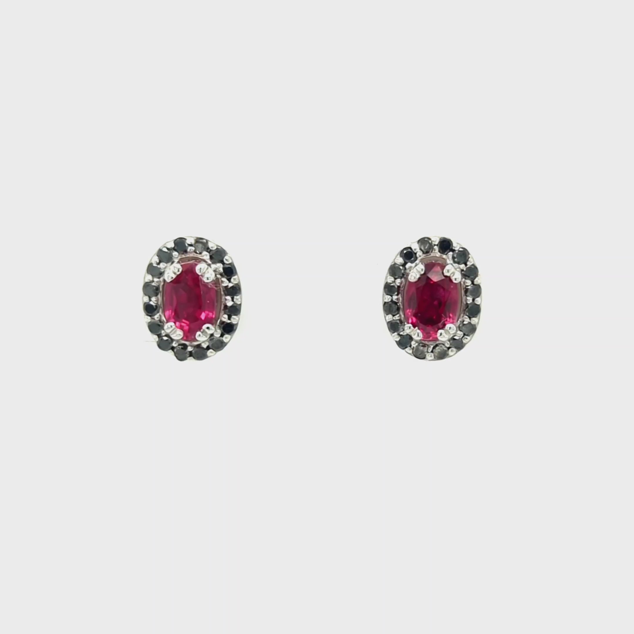 Ruby and Black Diamond Halo Stud Earrings in 14k White Gold