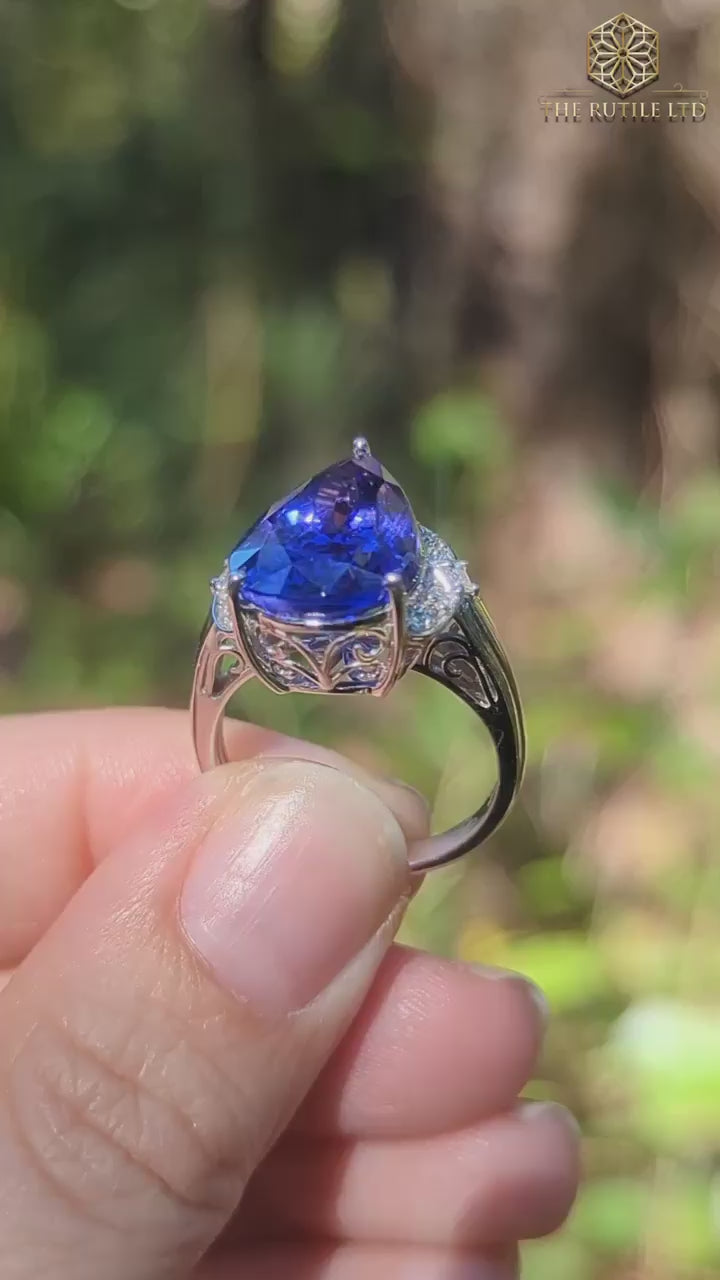 9.90 carats of gorgeous AAA-quality tanzanite is lovingly set in 18kt white gold with 0.18ct of bright sparkly diamonds. This tanzanite has been hiding in the back of a vault for decades as it was some of the very first tanzanite material mined in the 1980s! You can’t find amazing tanzanite like this anymore with the deep purples, blues, and red flash that just dazzles. Most of the tanzanite that comes from the mines now is very light and washed out, even with heat treatment! With tanzanite being about 1000 times rarer than diamonds and this color even rare, it makes sense that we sell a lot of tanzanite engagement rings!